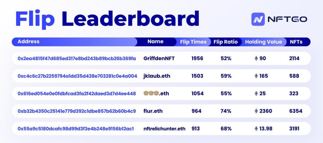 FlipTimes和FlipRatio是观察NFT数据的核心指标之一。Flip是指某笔NFT交易卖家盈利,也就是说——卖出价格大于买入价格。例如,所有NFT的历史交易里,假如一个NFT被出售4次,且全部给卖家带来了利润,就代表着这个NFT所归属的Collection有4次flip,而相对应的地址也被记为一次成功Flip。