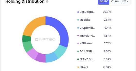 该地址所持有的现估价值最多的NFT是DigiDaigaku,占据了该地址所持有总数的30.81%。其次,位居第二的是Meebits。值得注意的是,在目前的集合中,TablelandRigs是@kdimes00买入价值最高的项目,占据28.34%,没有卖出,收益为负。