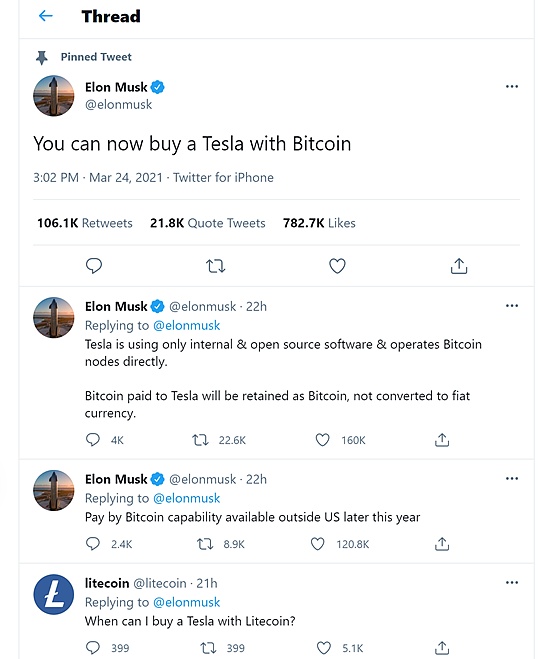 3月24日消息,马斯克发表推特称现在可以用比特币购买特斯拉
