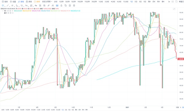 由于近期行情的下跌,恐惧指数也大幅下降。目前已从极度贪婪降为贪婪,比特币远期合约的基差也大幅下降。从3月13日最高9.71%降至目前不足5%。