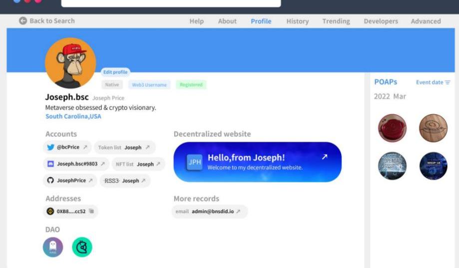 另外,BNS还将搭建基于BNS域名的Web3社交平台,用户可以在持有的域名中设置和展示个人资料信息,比如ERC20地址、邮箱,URL链接、Twitter、Github、Reddit、Telegram?等的信息;用户也可以将自己地址持有的ERC-721和ERC-1155标准的NFT设置成Avatar头像,在链上各个DAPP应用中展示。如下所示: