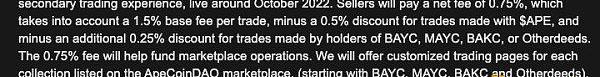 MagicEden选择了较为复杂的费用结构,基础费用为1.5%,但使用APE交易会有0.5%的折扣,如果持有BAYC、MAYC、BAKC等NFT将会再有0.25%的折扣。所以一般来说手续费将是0.75%,这些收入将作为市场的后续运行资金。