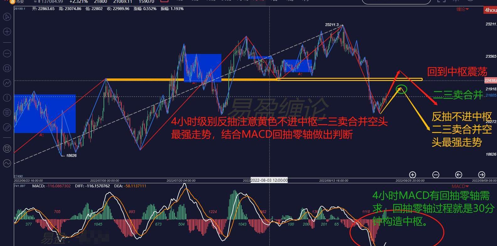 4小时级别上看,本次下跌为放量非背驰下跌,MACD快速拉低,现在正在回抽零轴。而MACD4小时回抽零轴的过程就是30分钟级别在构造中枢的过程。图中做了两种分类,其中黄色为二三卖合并空头最强走势,对于想要做多或者抄底的朋友来说是个巨大的风险存在,犹如泰山压顶。
