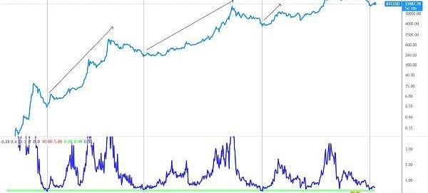 上方为BTC长期走势,下方为puellmultiple指标走势,puellmultiple表示以美元计价的一天开采的BTC与365天以美元计价的收入移动平均线之间的比值,主要衡量来自矿工的抛售压力,当puellmultiple处于阶段性的峰值时,矿工往往倾向于卖出,意味着BTC大概率已到达牛市顶部区域,而当puellmultiple处于阶段性的低点时,矿工往往倾向于持币,预示着BTC大概率处于熊市底部,后面酝酿下一轮牛市。