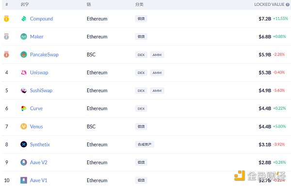 DeFi项目锁定资产前十排名及锁仓量,数据来源:Debank